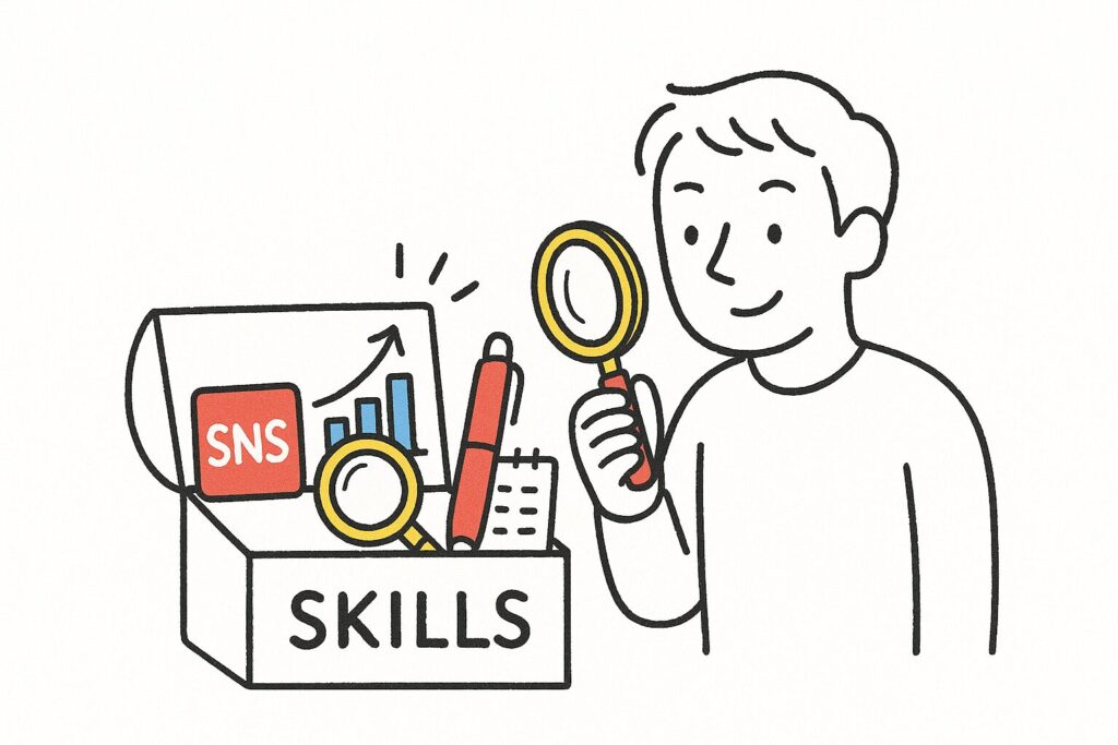次に、その領域で必要となる最小のスキル束(例:SNS運用なら企画/投稿設計/簡易デザイン/数値レポート)を、