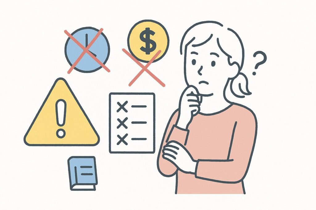 Webマーケティング副業は在宅完結・低リスクが魅力ですが、油断すると「時間浪費」「契約トラブル」「燃え尽き」の3点でつまずきます。本章では、主婦が陥りやすい典型パターンと、その回避策を明示します。正しい予防線を張ることで、長く続く副業ライフに変えましょう。