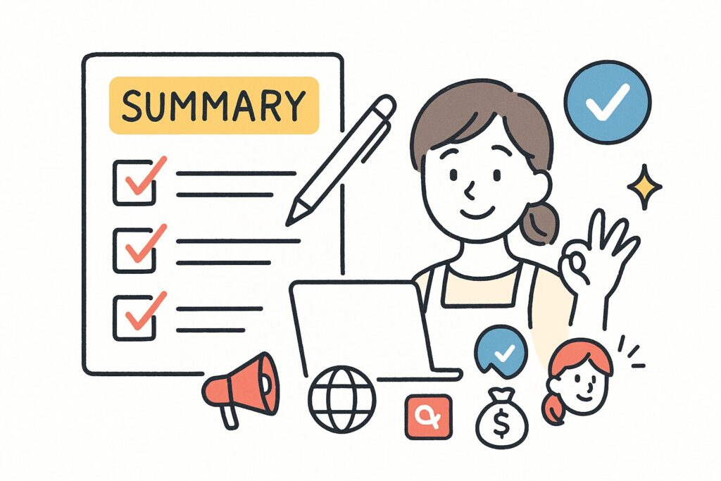 ここまでの内容を振り返ると、主婦がWebマーケティング副業で月5万円を稼ぐために必要なことはシンプルです。限られた時間で学びを成果に変える「順序」と「環境」を整えること。そのために、この記事で紹介した全ステップを3行にまとめます。