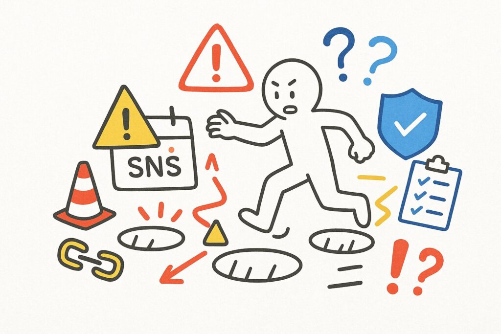 ここからは“守り”を固めます。低リスクとはいえ、準備不足のまま走り出すと、時間やお金、信頼を失いやすい局面があります。本章では、契約・就業規則・税務・情報管理(炎上含む)の4観点で、典型的なつまずきと回避手順を分解します。先に落とし穴の位置を把握しておけば、踏むリスクは劇的に下がります。準備は面倒に見えますが、一度雛形化すれば次回からは数分で完了します。