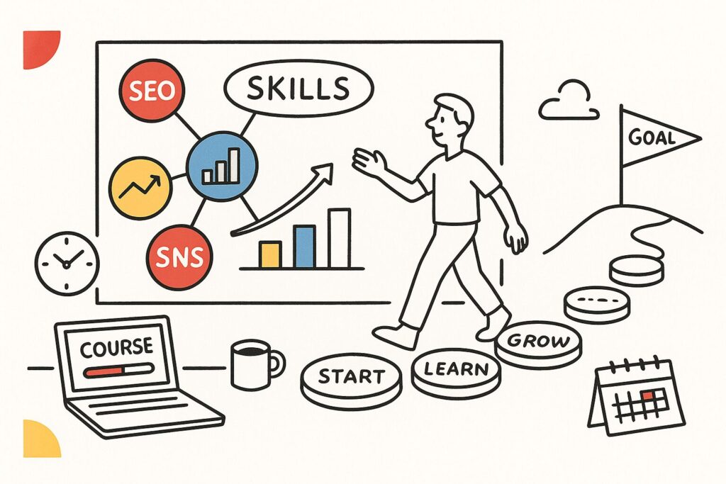 独学でもWebマーケティングは習得可能です。重要なのは「教材を選びすぎない」「手を動かす時間を確保する」こと。最初の1ヶ月で3つの教材を完走すれば、十分な基礎力がつきます。