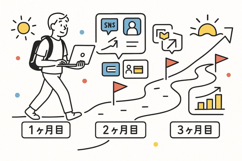 - 1ヶ月目:情報収集と学習 → SNS・SEO基礎を理解