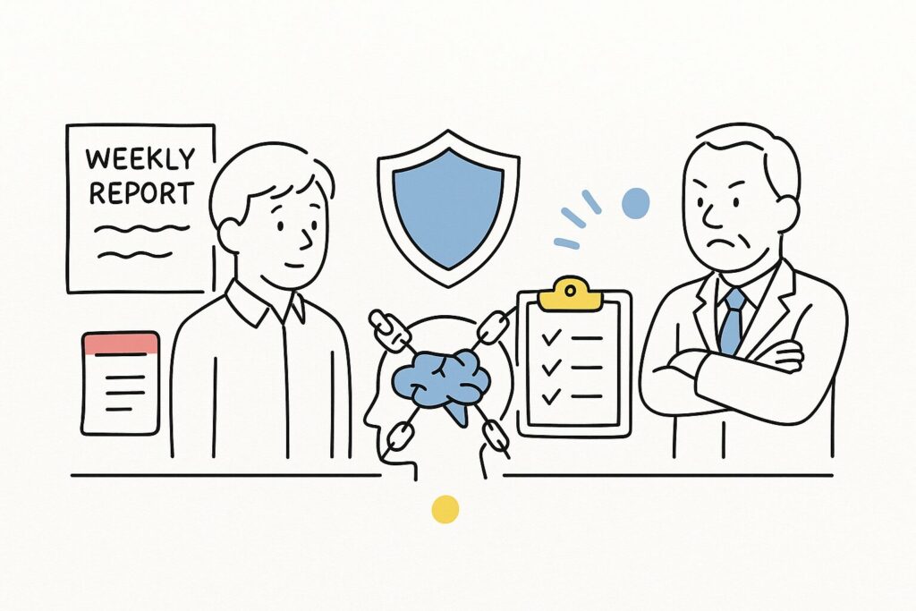 週報テンプレに“今週の判断待ち”欄を作ると、口頭の細かい介入が減る=境界線が強化されます。