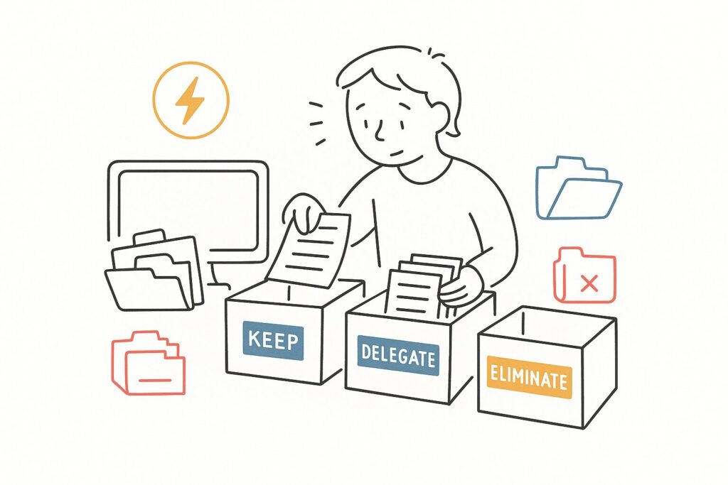 残留を選ぶ場合の最短手は、業務棚卸しです。あなたの一週間を分解し、やめる/減らす/任せる/仕組み化に再配分。可視化→交渉の順で進めます。
