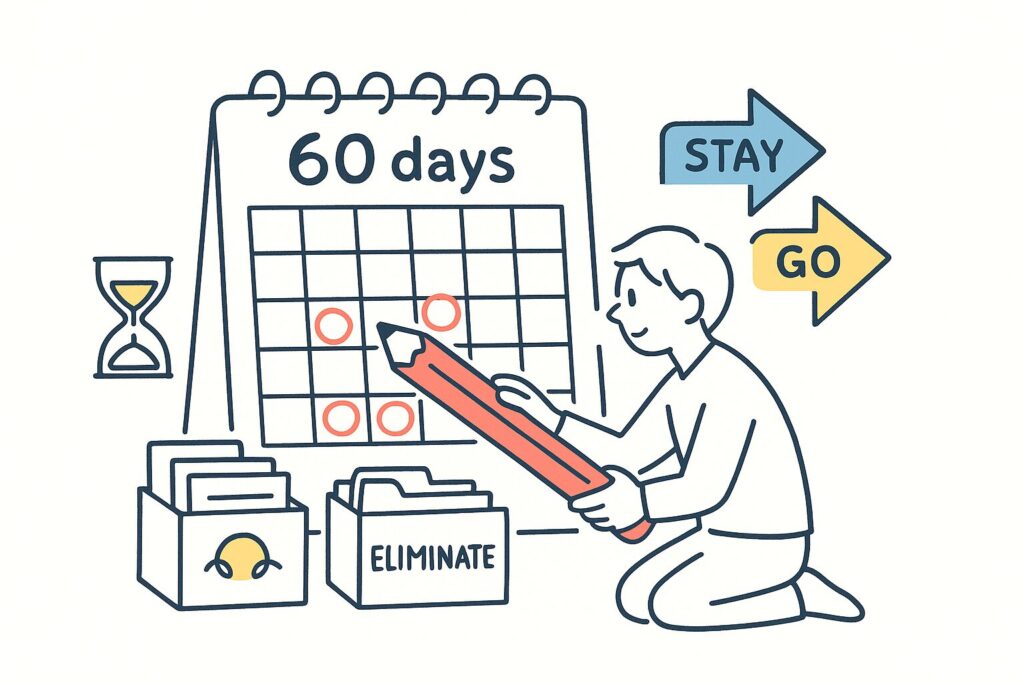 迷いが強いなら、60日間の猶予プランを。前半30日で負荷軽減+診断/相談、後半30日で引継ぎ設計+有給計画。どちらに転んでもダメージ最小化。