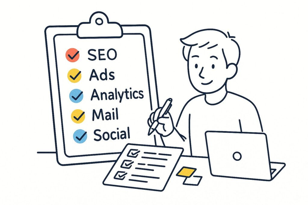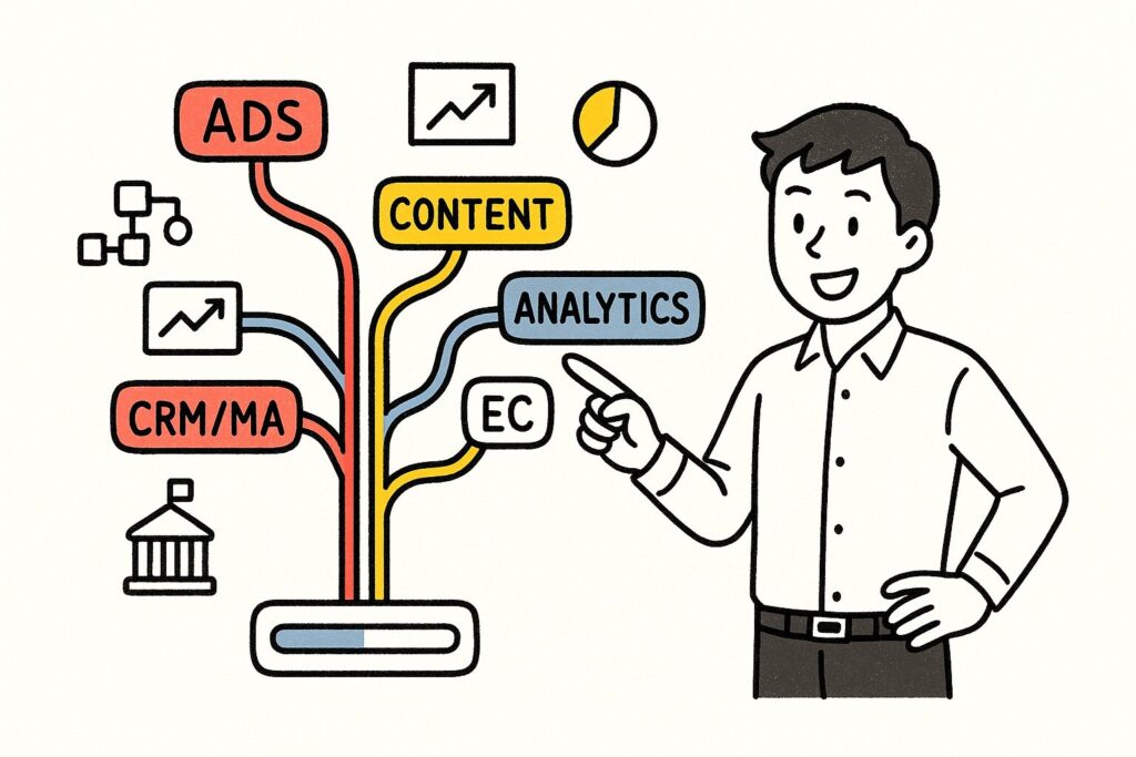 - 基礎(2〜4週):デジタルマーケ基礎、KPI設計、LTV/CPA/ROASの概念、主要チャネル(検索/広告/ソーシャル/メール)