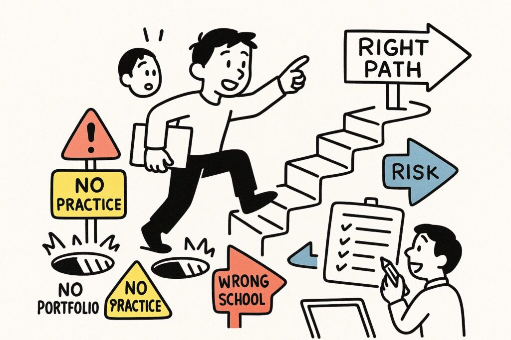 - 基礎→実務演習→案件→成果物→面接対策の5段階を崩さない