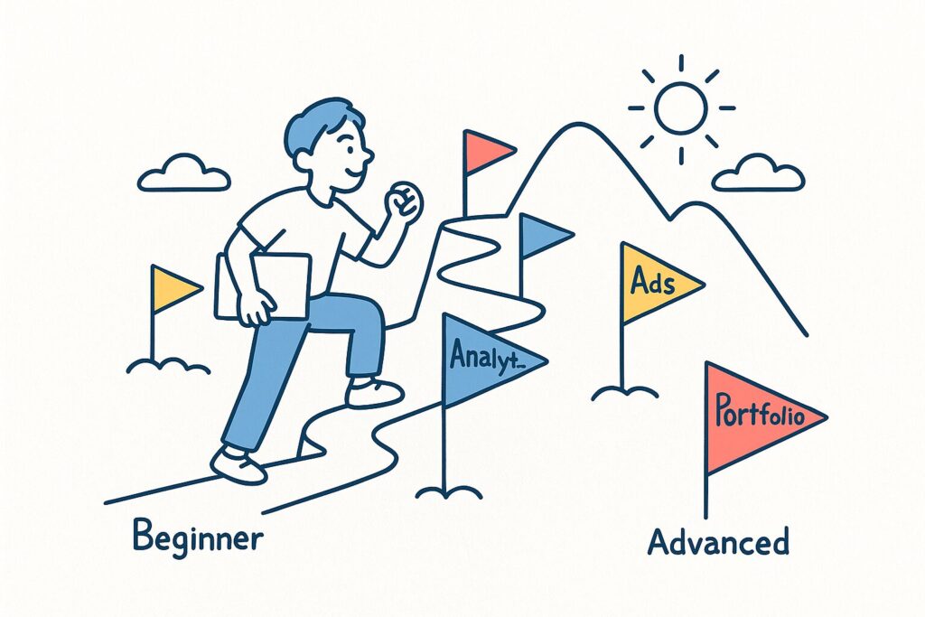 未経験からwebマーケティングでキャリアアップするには、段階的にスキルを積み重ねる必要があります。以下は推奨スキルマップです。